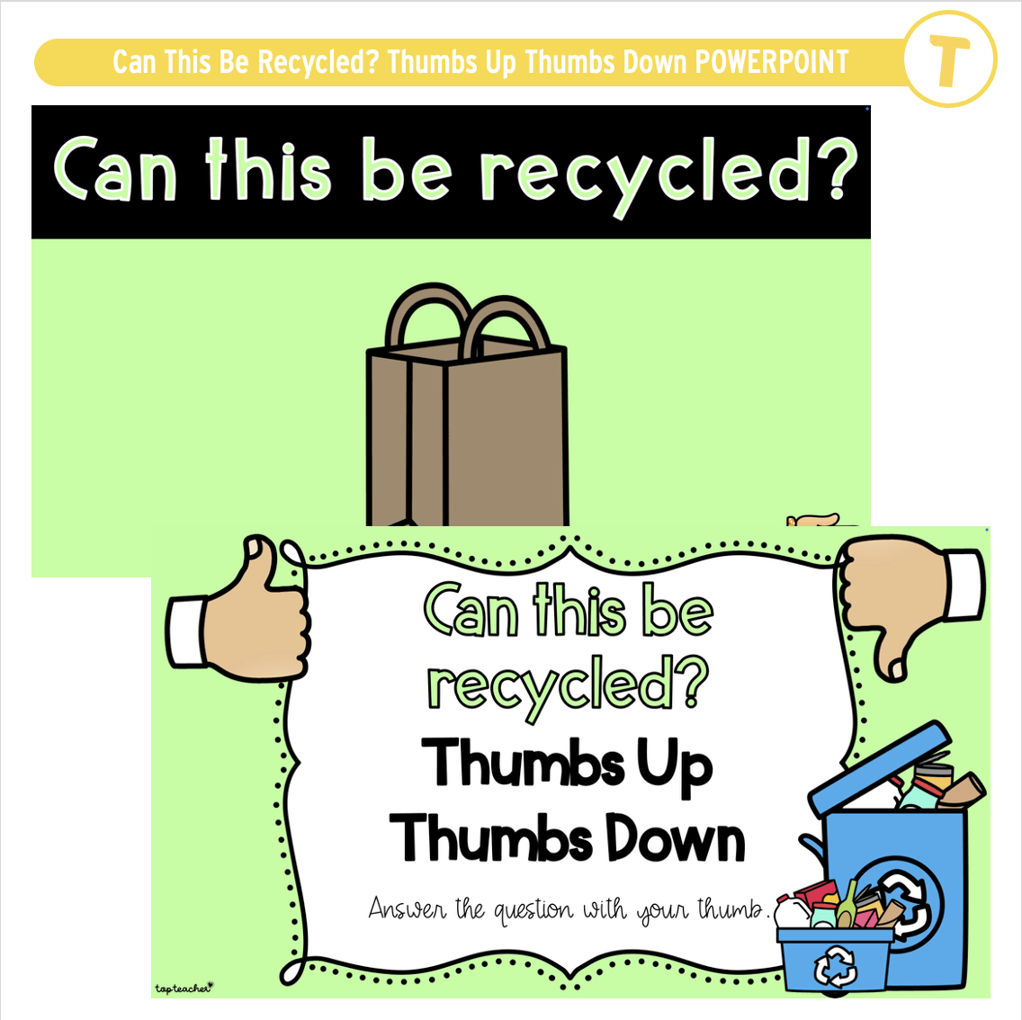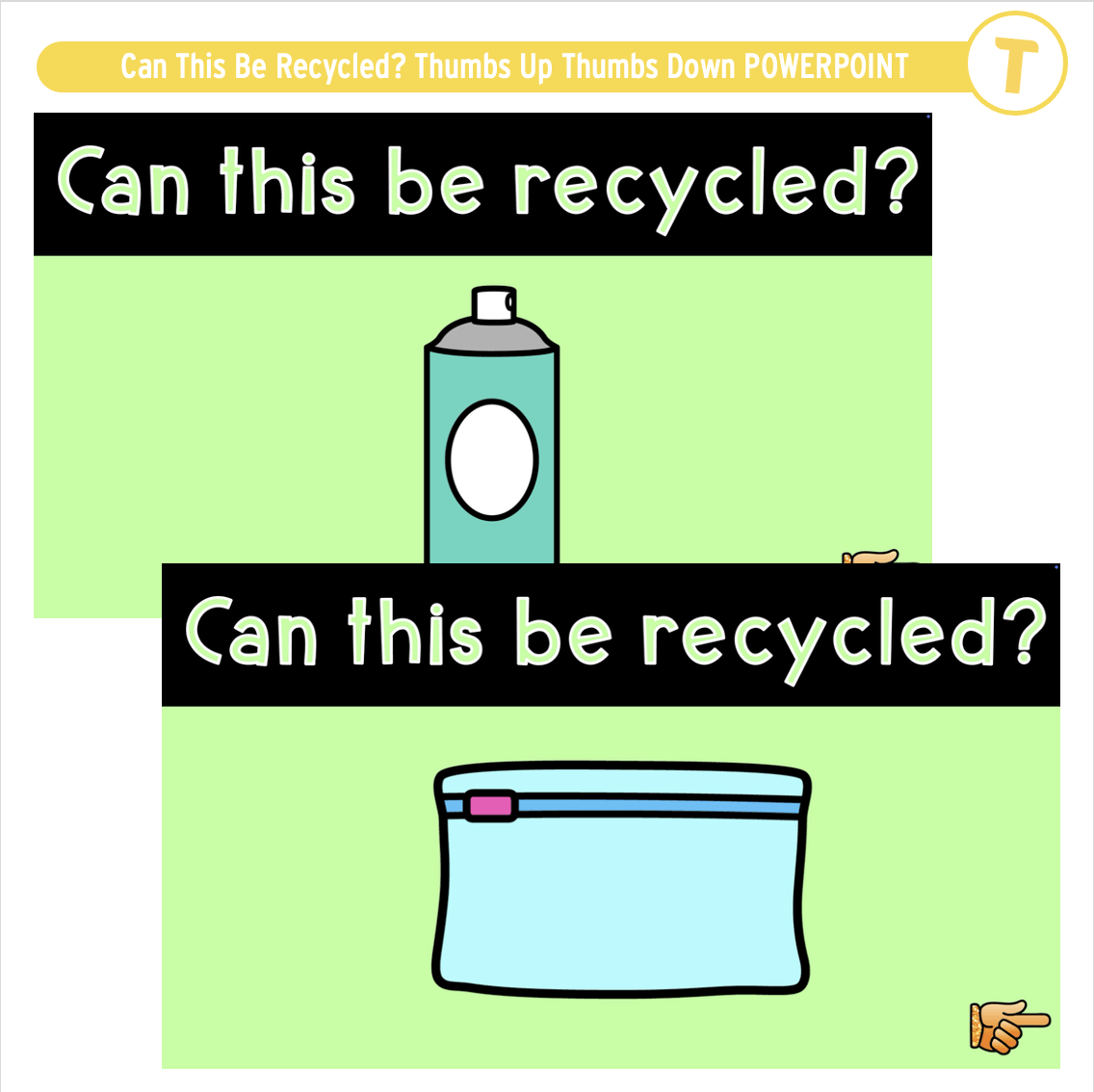 Use our interactive Thumbs Up Thumbs Down PowerPoint when identifying which household objects can be recycled in the mixed recycling bin.