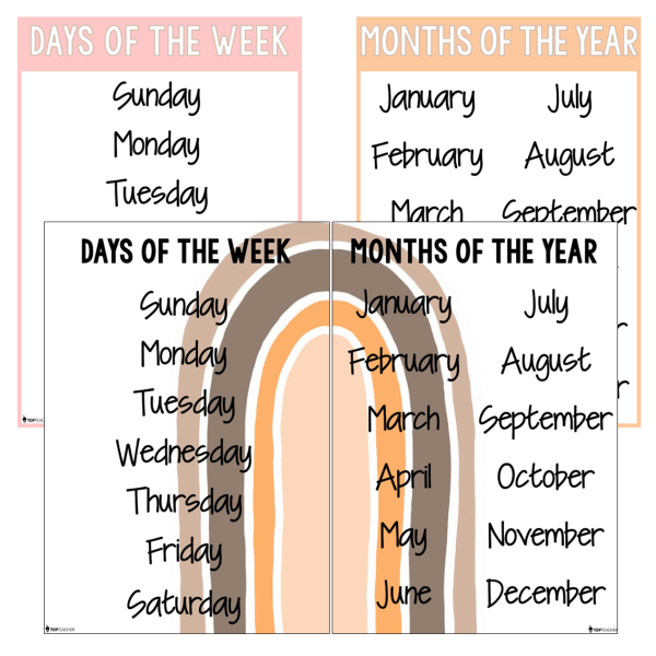 - Encourage students to reference the posters when sequencing days or spelling months.
