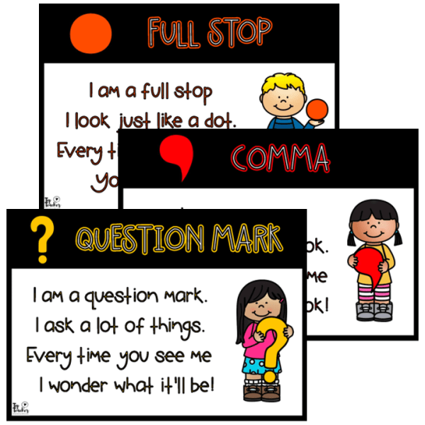 - Punctuation marks covered: full stop, comma, question mark, quotation marks, apostrophe, exclamation mark